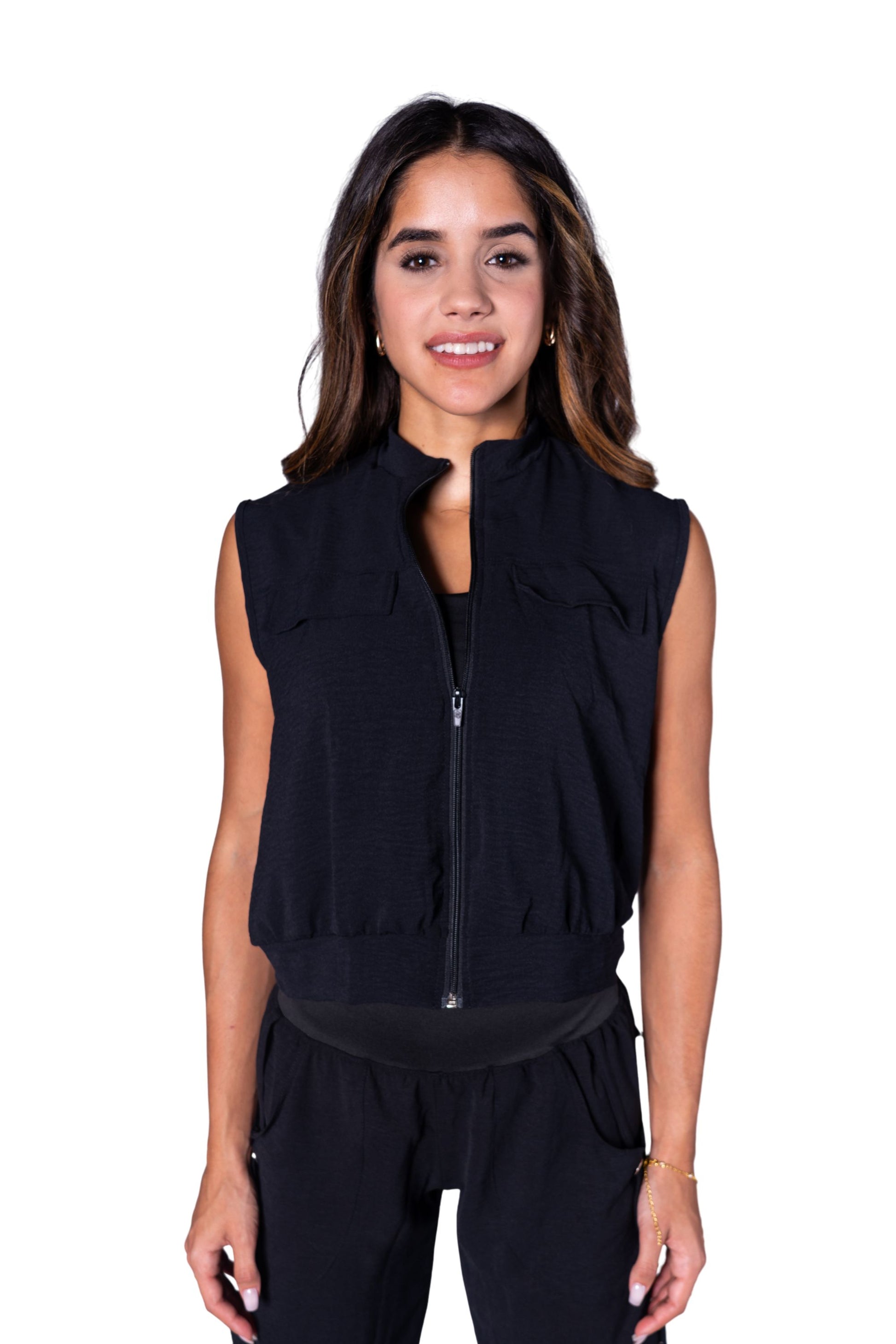 This black cargo vest features a convenient front zip closure and two breast pockets, making it perfect for storing essentials while on the go. Its sleek design and durable material provide both style and functionality. Complete the look with the matching cargo skirt! Elevate your wardrobe with this must-have piece