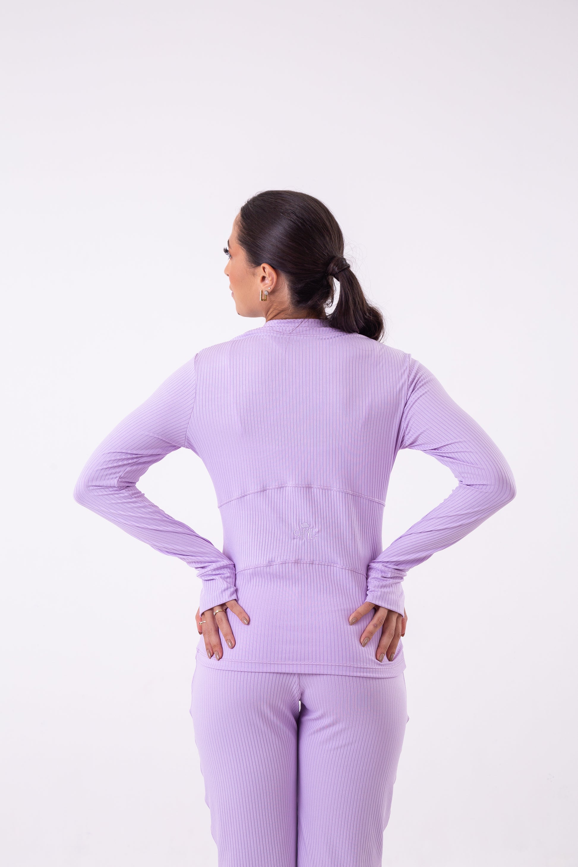 Introducing the Lavender Ribbed Jacket. Made of high-quality materials, this versatile jacket can be worn open or closed, allowing for ultimate comfort and style. Pair it with the matching joggers for a complete and fashionable look. Elevate your wardrobe with this must-have piece.