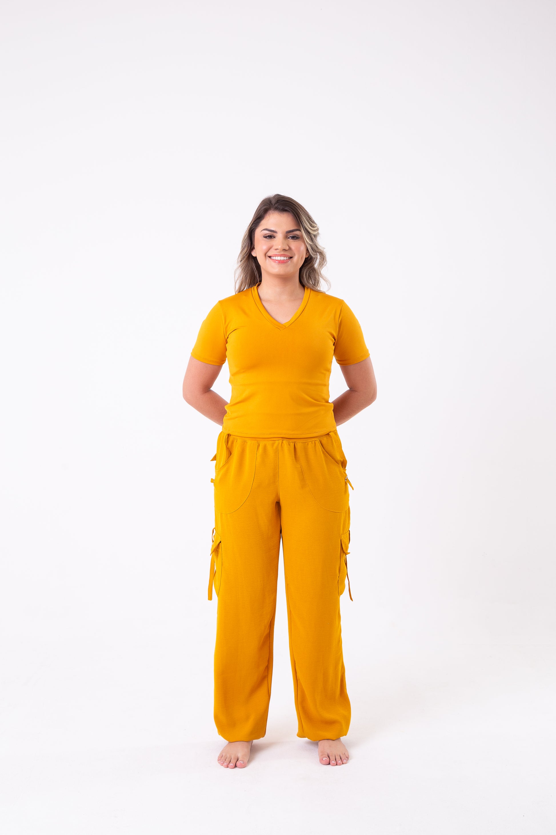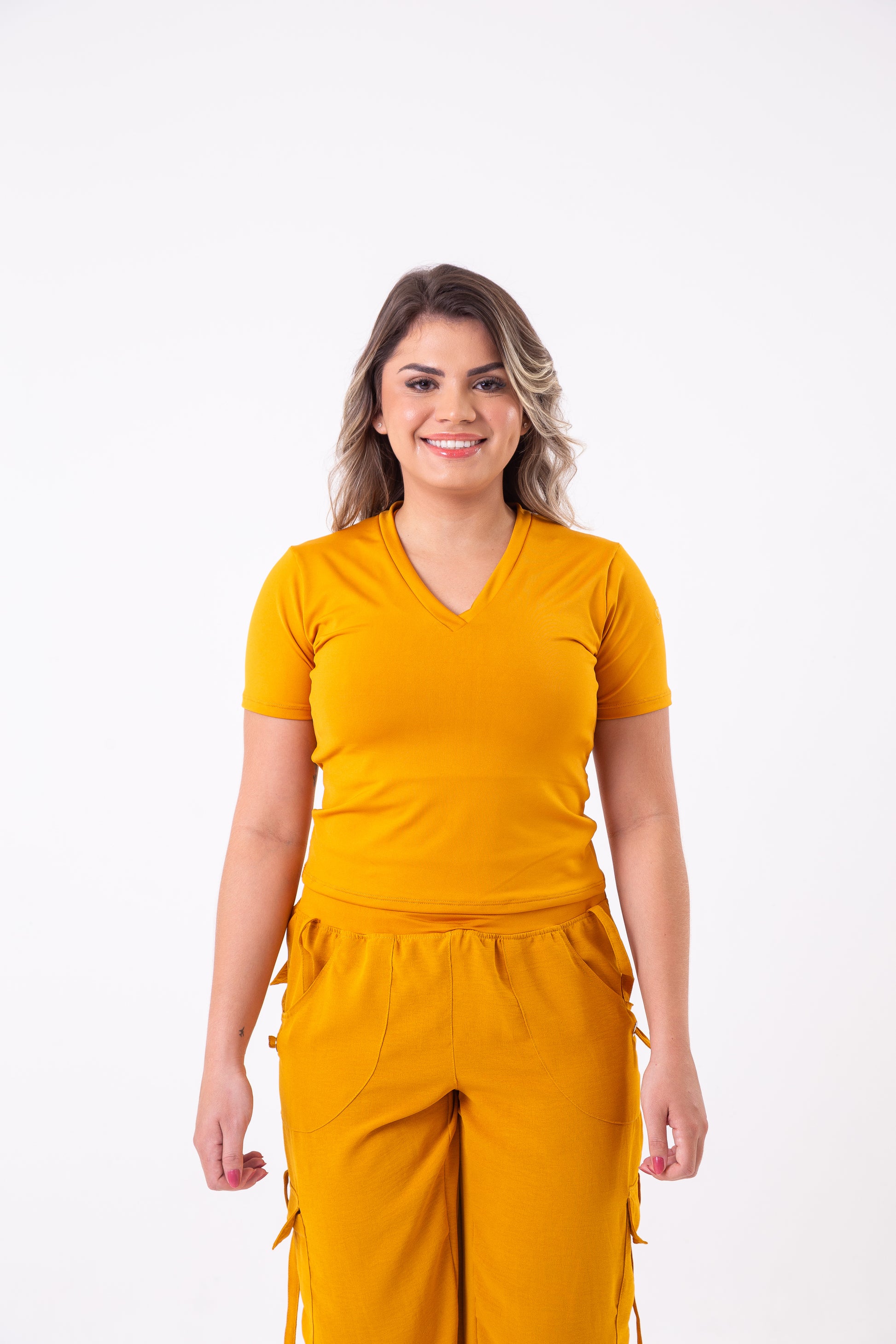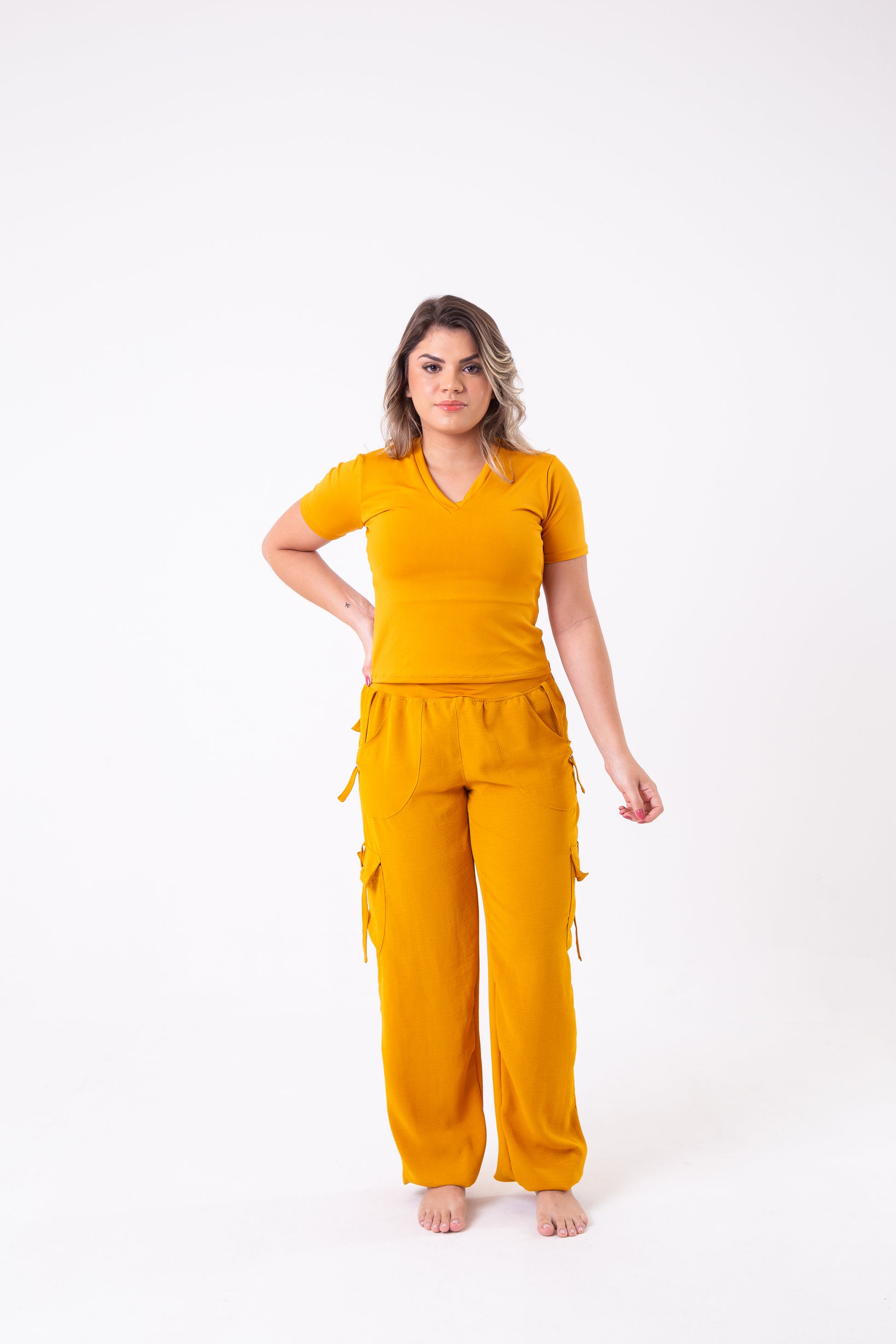 The Mustard V-Neck Cropped Tee is a stylish and versatile addition to your wardrobe. Made of high-quality fabric, this tee features a flattering V-neck design and a cropped length, perfect for pairing with high-waisted bottoms. With its vibrant mustard color, this tee will add a pop of color to any outfit. Shown styled with our best selling cargos.