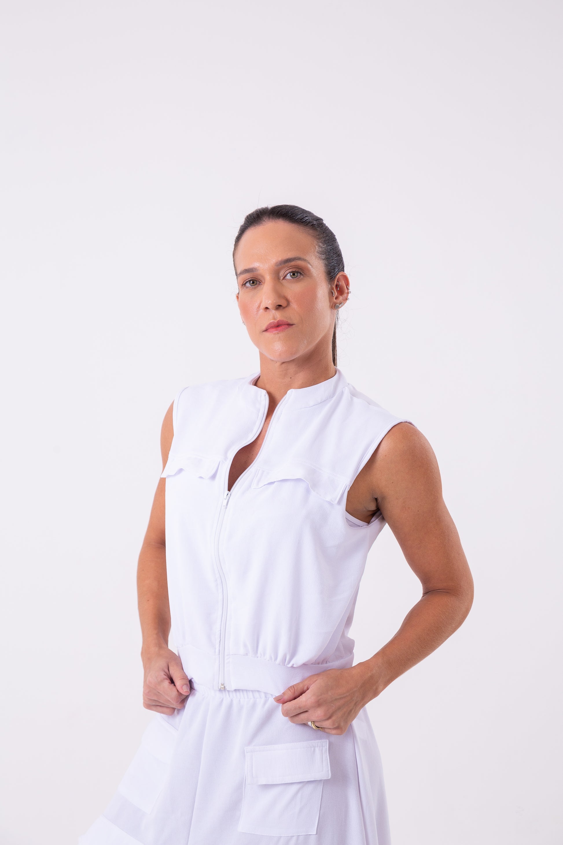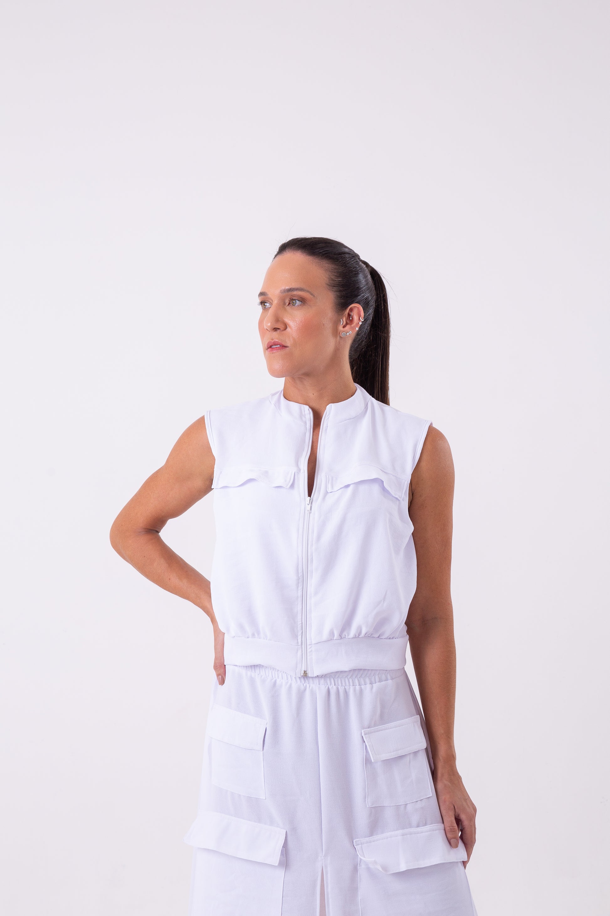 This white cargo vest features a convenient front zip closure and two breast pockets, making it perfect for storing essentials while on the go. Its sleek design and durable material provide both style and functionality. Complete the look with the matching cargo skirt! Elevate your wardrobe with this must-have piece.