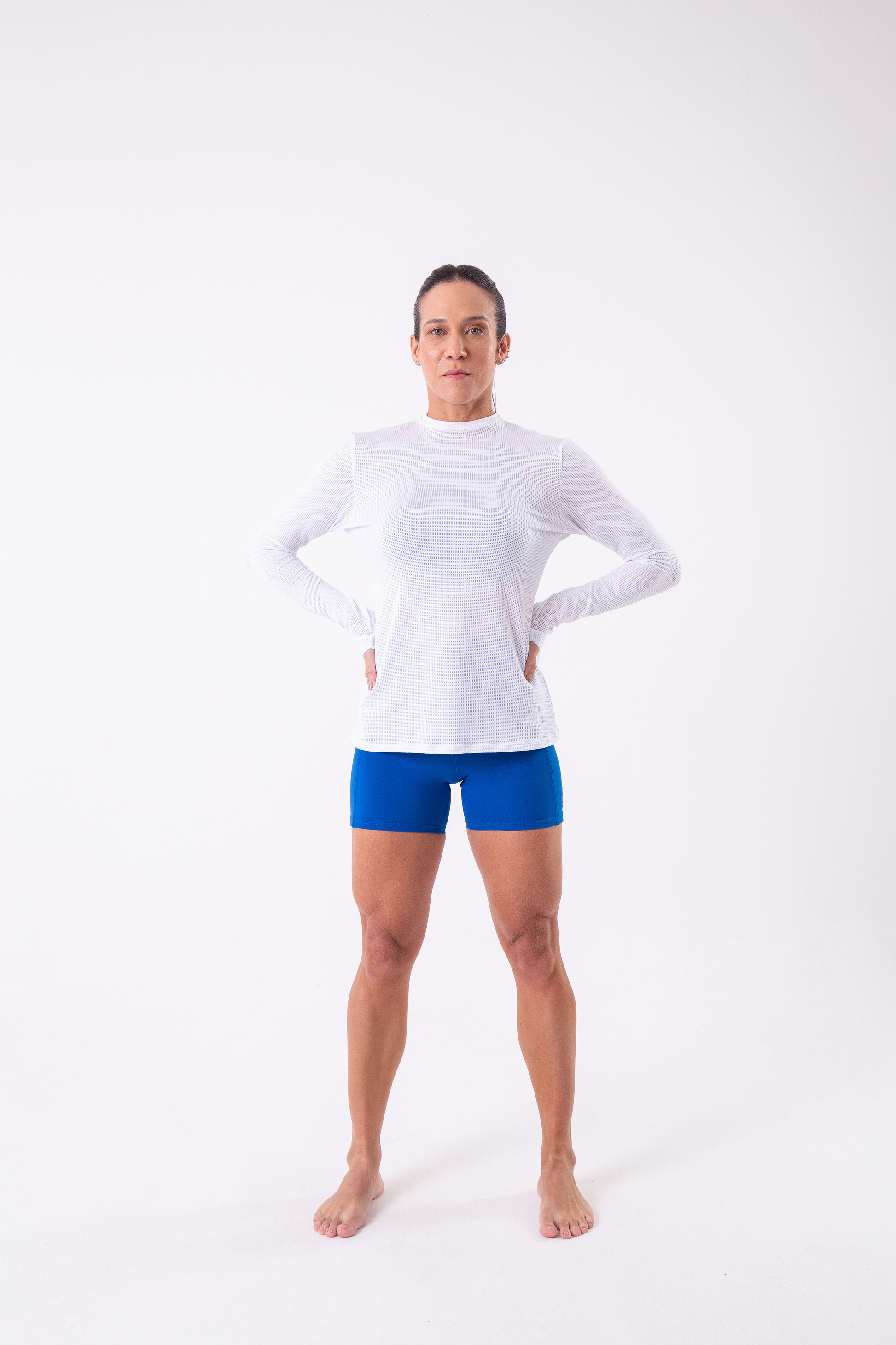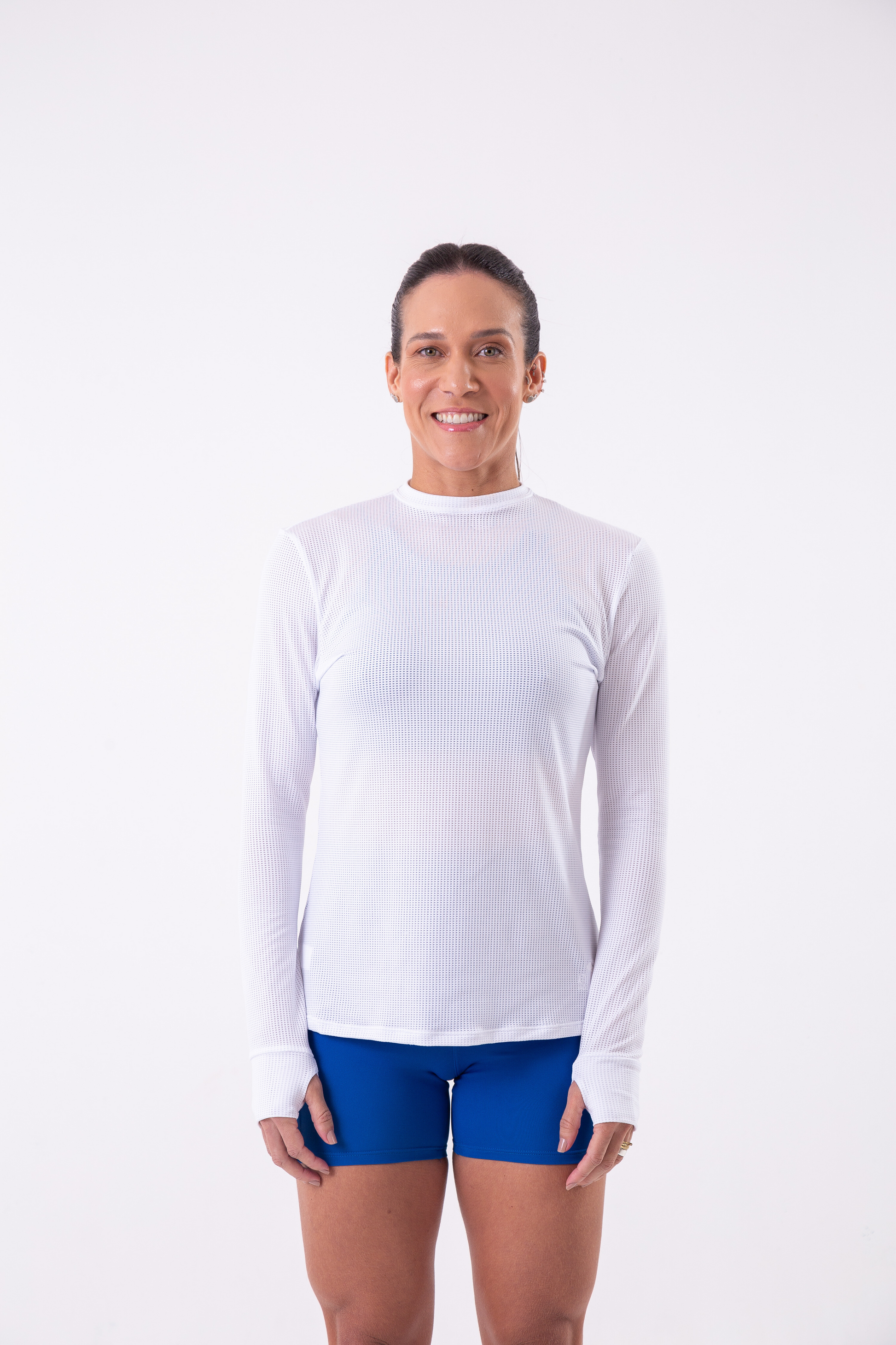 Stay cool and comfortable while working out with our White Long Sleeve Mesh Shirt. Its high neckline provides extra coverage and the thumb holes keep sleeves in place. Made with breathable mesh fabric for ultimate performance. Perfect for any fitness activity.
